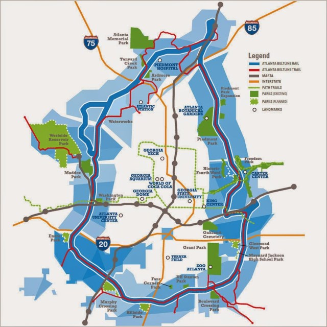 “The Atlanta BeltLine is a sustainable redevelopment project that will provide a network of public parks, multi-use trails and transit along a historic 22-mile railroad corridor circling downtown and connecting many neighborhoods [and city parks] directly to each other.”