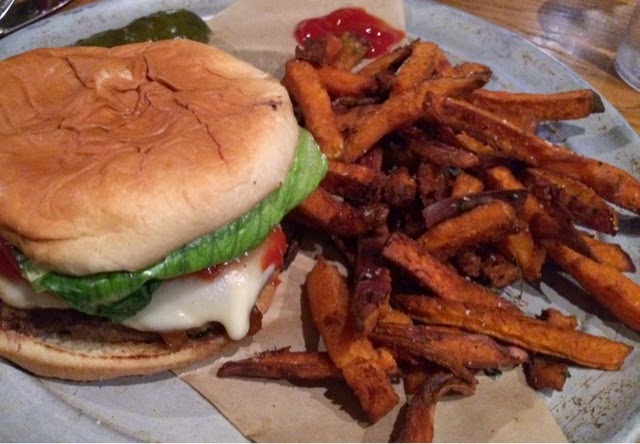<The Bruno Burger– $10- “half pound of grass-fed ground turkey (or beef or chicken if you prefer), topped with caramelized onions, mushrooms & provolone, potato bun”. Sorry that the picture looks so messy.. it’s because it was a messy meal. Haha Nonetheless I really enjoyed this burger- the caramelized onions always add great flavor! For my side I choose sweet potato fries and lets be honest, they’re always a great choice. Overall, I could definitely see myself going back to Ormsby’s for this entree.