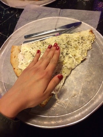 The slices range from $3-5. But wow writing this post makes me want to eat this again. There was so much flavor in each slice. I had the white pizza and thought it was amazing. You can taste the perfect amount of garlic as well as the ricotta. Also, it is important to mention the size of the slices.. do you see this?? It was basically double the size of my hand. Perfection.