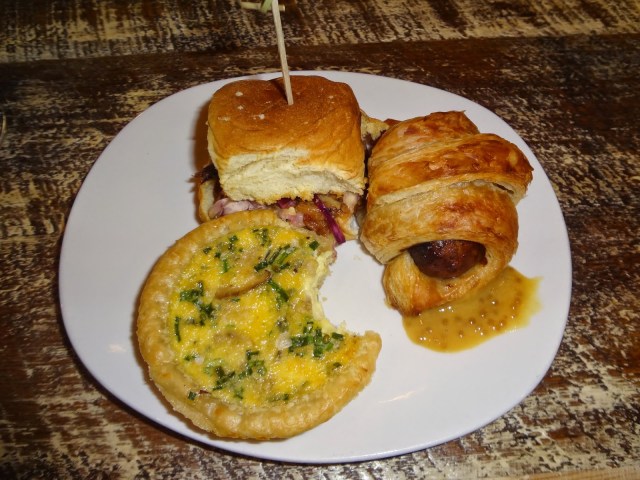 Here was my plate! I dipped the “pig in a blanket” in a mustard sauce and it added a great contrast in flavor! I also was able to try a frittata which had mushrooms and spinach inside! I took an extra for the road because it was so good! Definitely check out this place if you want some high quality food and a glass of wine to wind down!