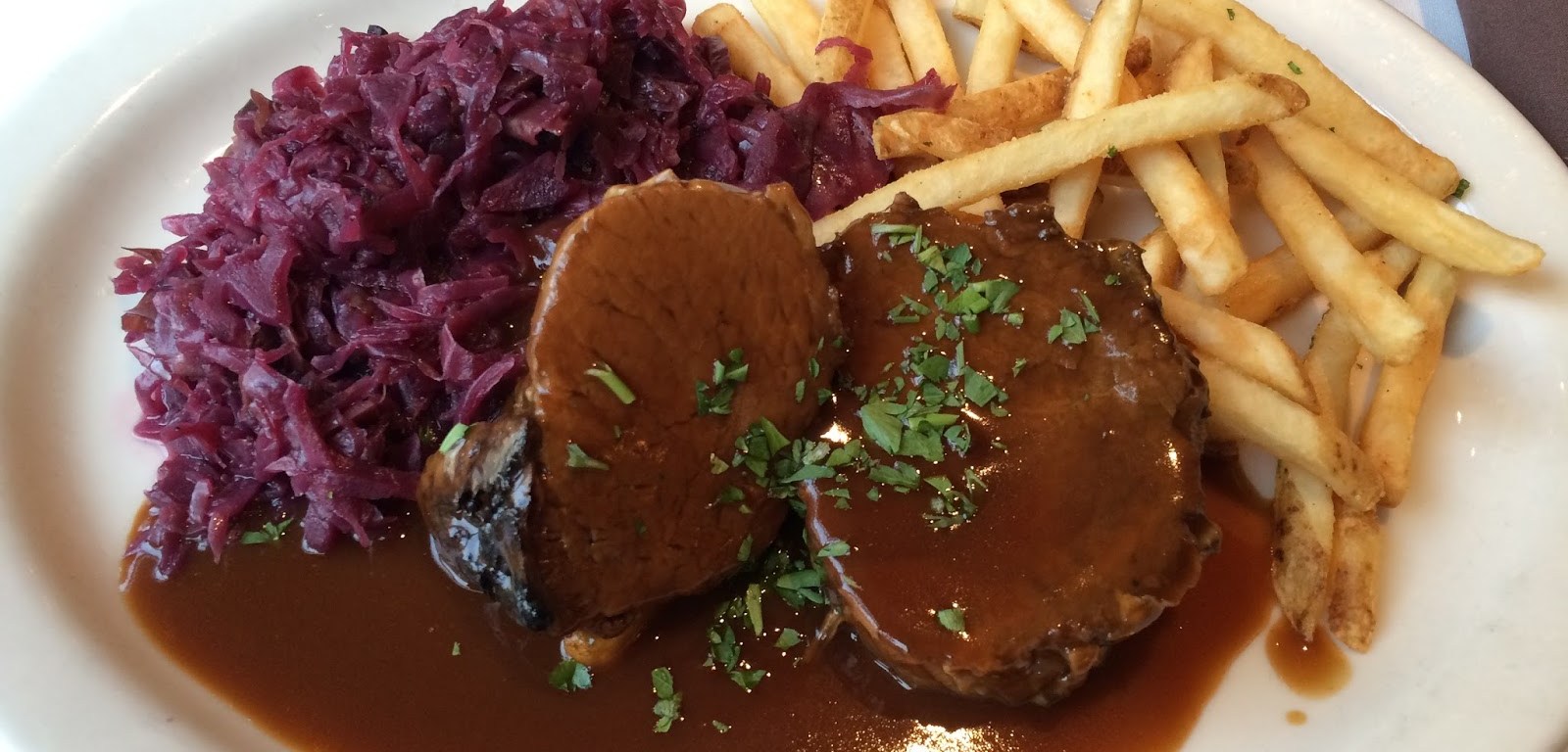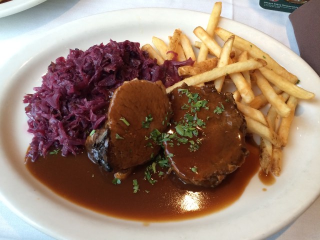 Below: Sauerbraten– $16: A dish with “braised rump roast of beef, marinated in red wine, vinegar and spices with a tangy ginger snap sauce and french fries”. This dish was great as well!