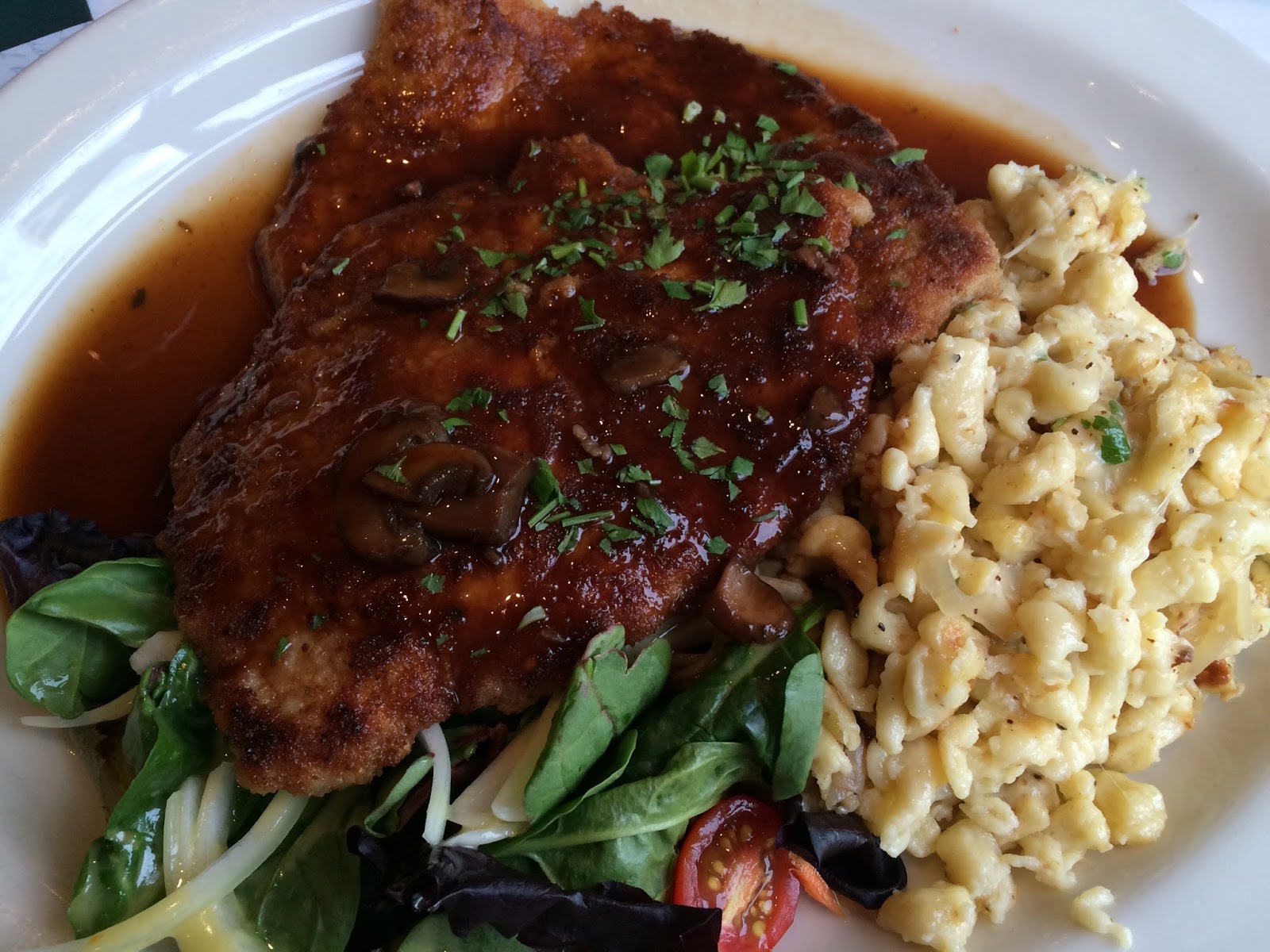 Above: Jägerschnitzel– $21: A dish with “lightly breaded pork served with hunters sauce of mushroom, bacon and onion with spätzle”. (Spätzle is a kind of egg noodle.) This dish was really good! The schnitzel’s batter had a great crunchy texture to it and the sauce was flavorful too!