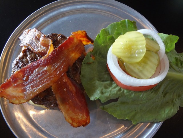 ($10.57) An angus steak patty filled with cheddar cheese and topped with bacon, pickles, onion, tomatoes, and lettuce