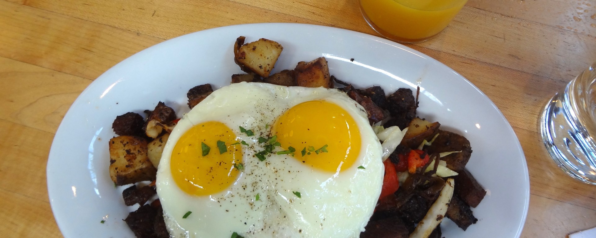 Smoked Hash– $11- crisped pastrami, potatoes, cabbage, peppers, caramelized onions, and sunny eggs- I got this dish and it was great and filling! I broke the egg onto the dish and loved the mix of different textures on this plate! The pastrami was definitely my favorite!