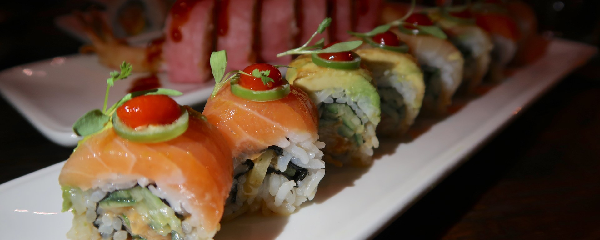 Over the Rainbow Roll- $12- Salmon, mango, cucumber, topped with white fish, avocado, wasabi lime, white yuzu sauce, and sriracha- The variety of this sushi roll was great as some were topped with white fish and some were topped with avocado. The mango was a nice change up from the fish in the sushi roll as well!